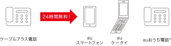 ご自分のauスマートフォン・auケータイからご自宅のケーブルプラス電話への国内通話が24時間無料!