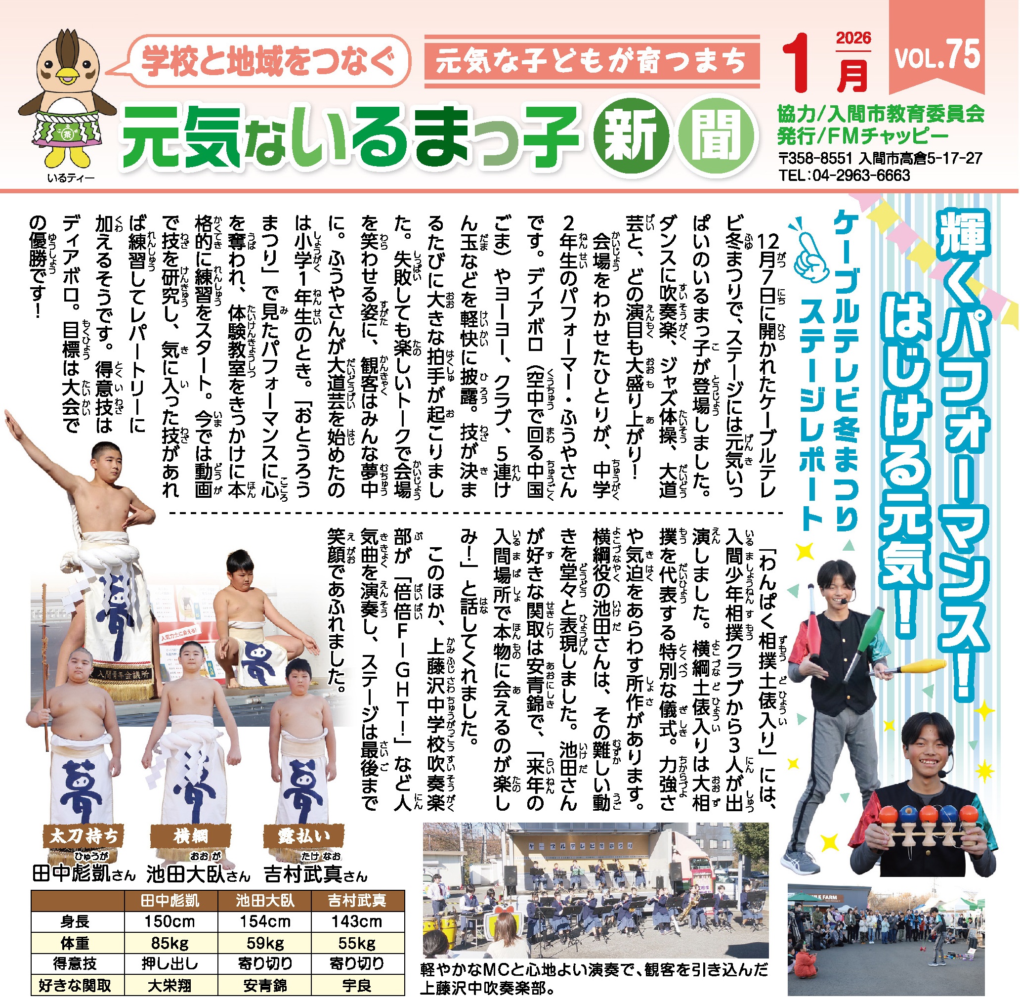 12月7日に開かれたケーブルテレビ冬まつりで、ステージには元気いっぱいのいるまっ子が登場しました。ダンスに吹奏楽、ジャズ体操、大道芸と、どの演目も大盛り上がりでした! いちばん会場をわかせたのは、中学2…