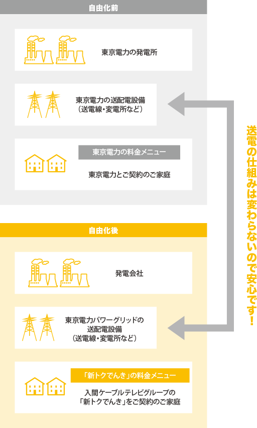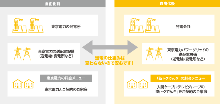 東京電力パワーグリッドの送配電設備を利用して、お客さまのご家庭にお届けしますので、でんきの品質も従来と変わりなく、安心してでんきをお使いいただけます。
