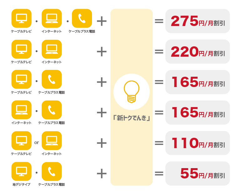 ※ 上記セット割引は、税込表示です。※ 上記「ケーブルテレビ」は、STB(専用チューナー)をご利用中の方です。