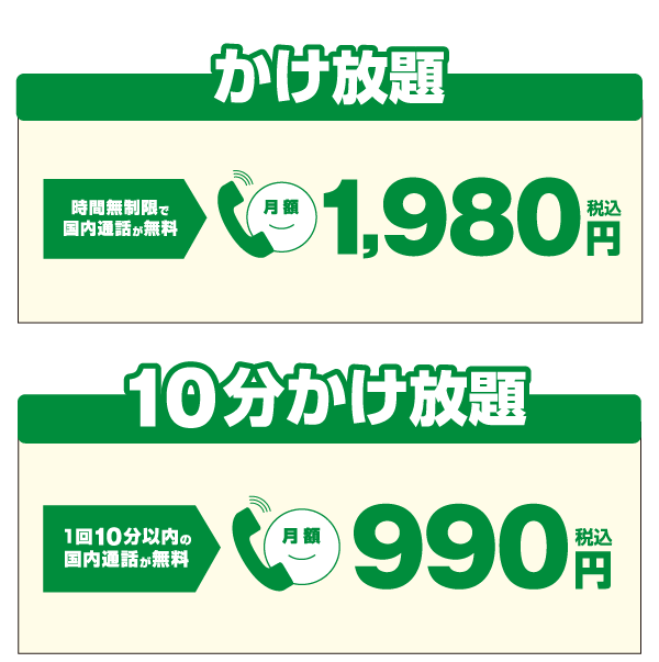 ※フリーダイヤル・ナビダイヤル(0570) ・110番等の3桁番号・国際電話・転送電話・テレビ電話 ・ 衛星電話・特定の電話番号への発信は対象外です。 ※通話定額オプションは、お申し込み後キャンセルができません。 ※新規で通話定額オプションをお申し込みされたお客様は、お申し込みされた日からご利用いただけます。 利用中の通話定額オプションを変更されたお客様は、お申し込みした翌月1日よりご利用いただけます。 ※通話定額オプションの利用料金は利用開始月から満額発生します。※通話定額オプションを解約される場合、解約申し込み日にかかわらず月末解約となり、 料金は満額発生します。 ※一般的な利用を逸脱したものと想定される通話 (長時間にわたる通話等) は、 当社の判断のもとに切断する場合があります。