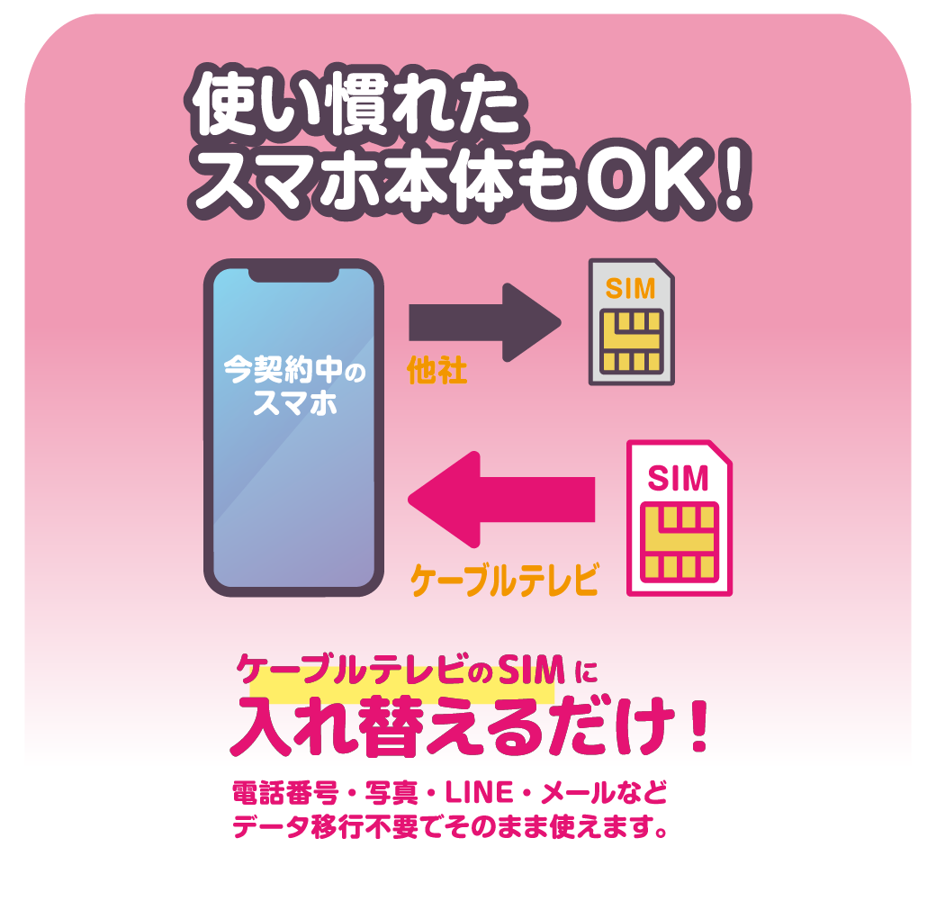 お使いのスマホのSIMカードを差し替えるだけでOK!写真や電話帳の移行などの面倒な作業は一切なし。どなたでも簡単にお使いただけます。