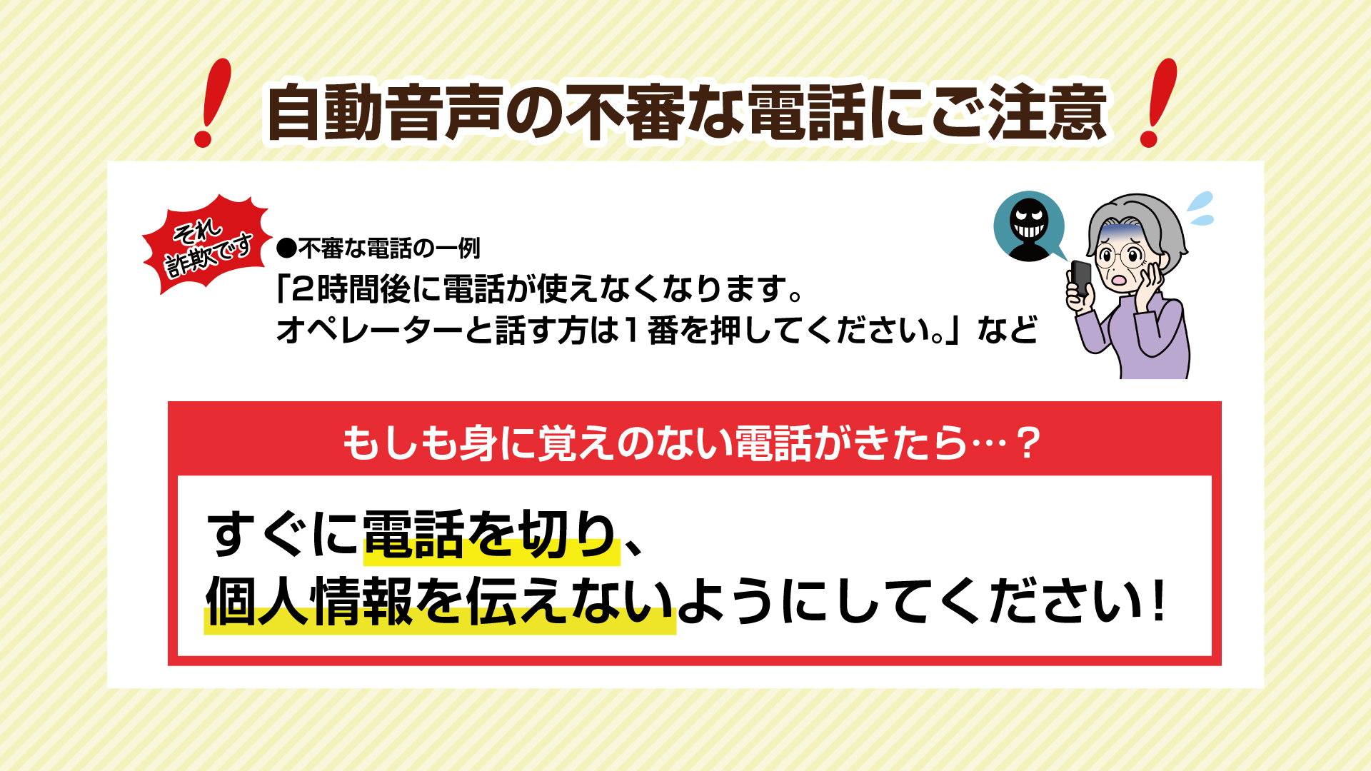 身に覚えのない電話がかかってきた場合はすぐに電話を切り、個人情報を伝えないようにしてください。