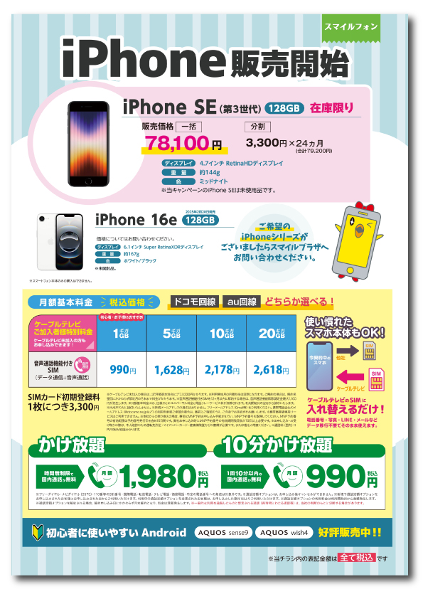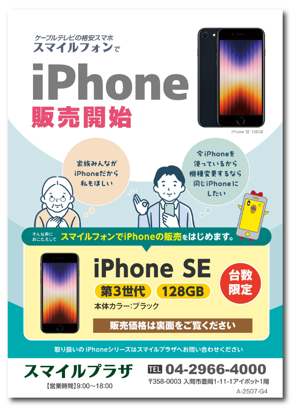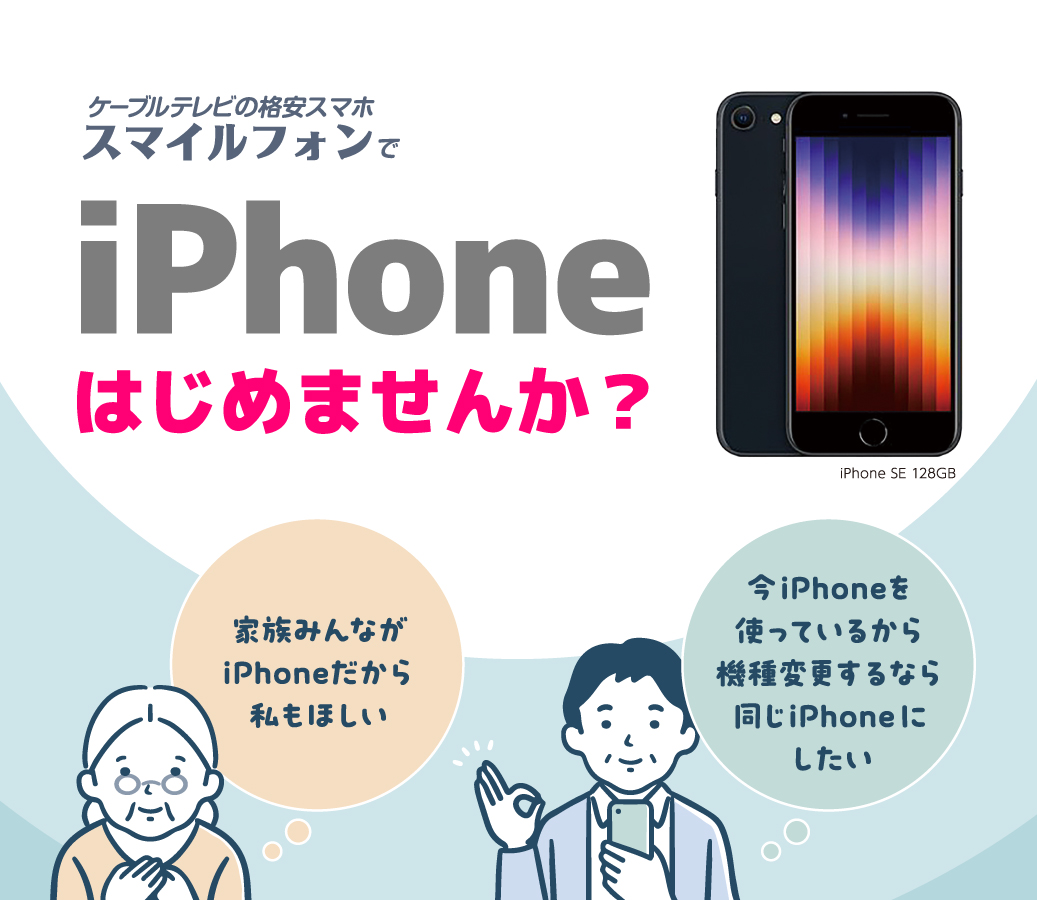 ケーブルテレビのスマイルフォンでiPhoneをはじめませんか?ケーブルテレビだからサポートも充実♪悩んだらすぐに相談できて安心です。買い替えの方も大歓迎!お問い合わせはお気軽にどうぞ。スマイルプラザまでお電話ください。 ※iPhoneはお申し込みいただいてからお渡しするまで1週間~10日前後かかります。