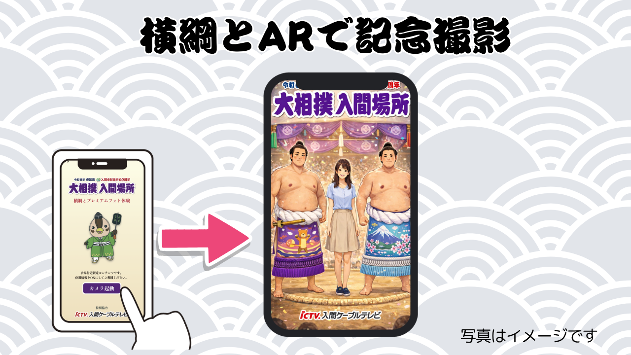 スマートフォンをかざすだけで、横綱と並んだ記念写真が完成。入間場所でしか撮れない特別な一枚をお楽しみください。