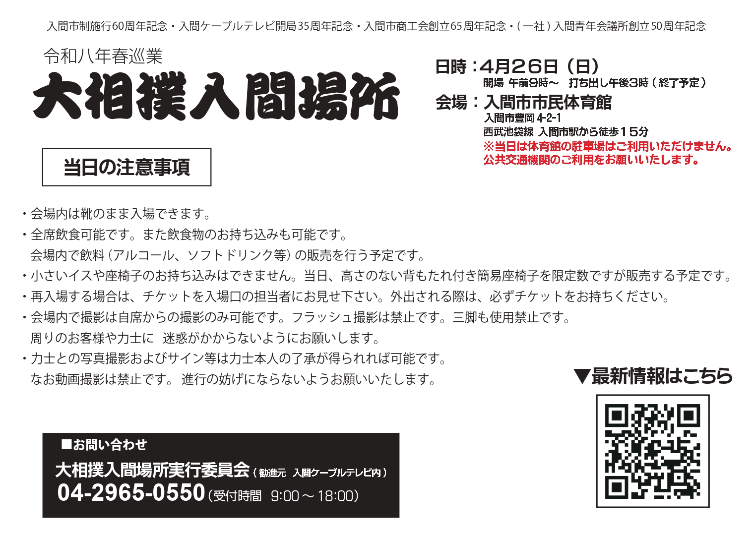 ・福祉席チケットをお持ちの方のご来場方法に関しましては、大相撲入間場所事務局までお問い合わせください。