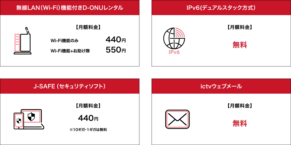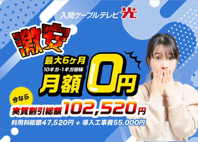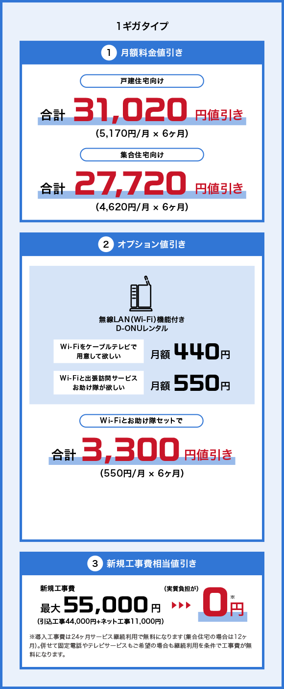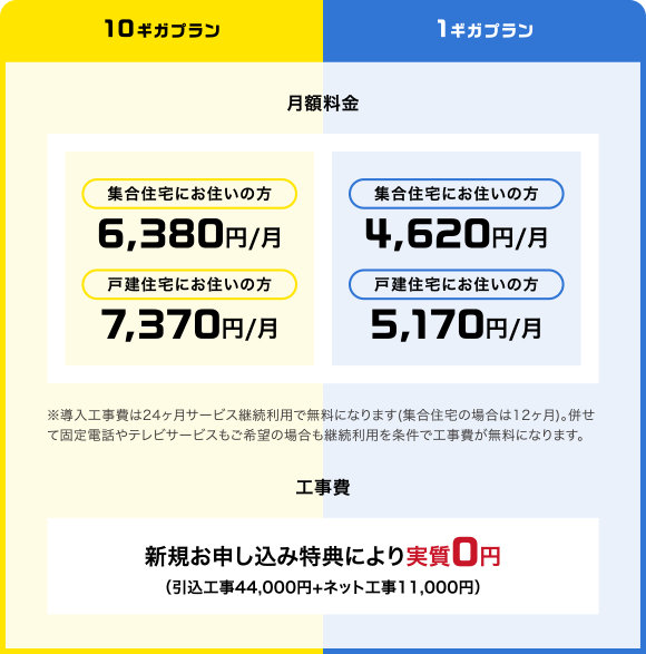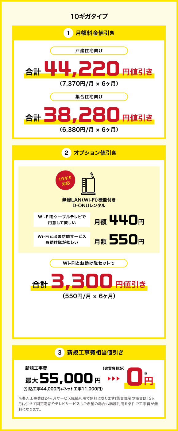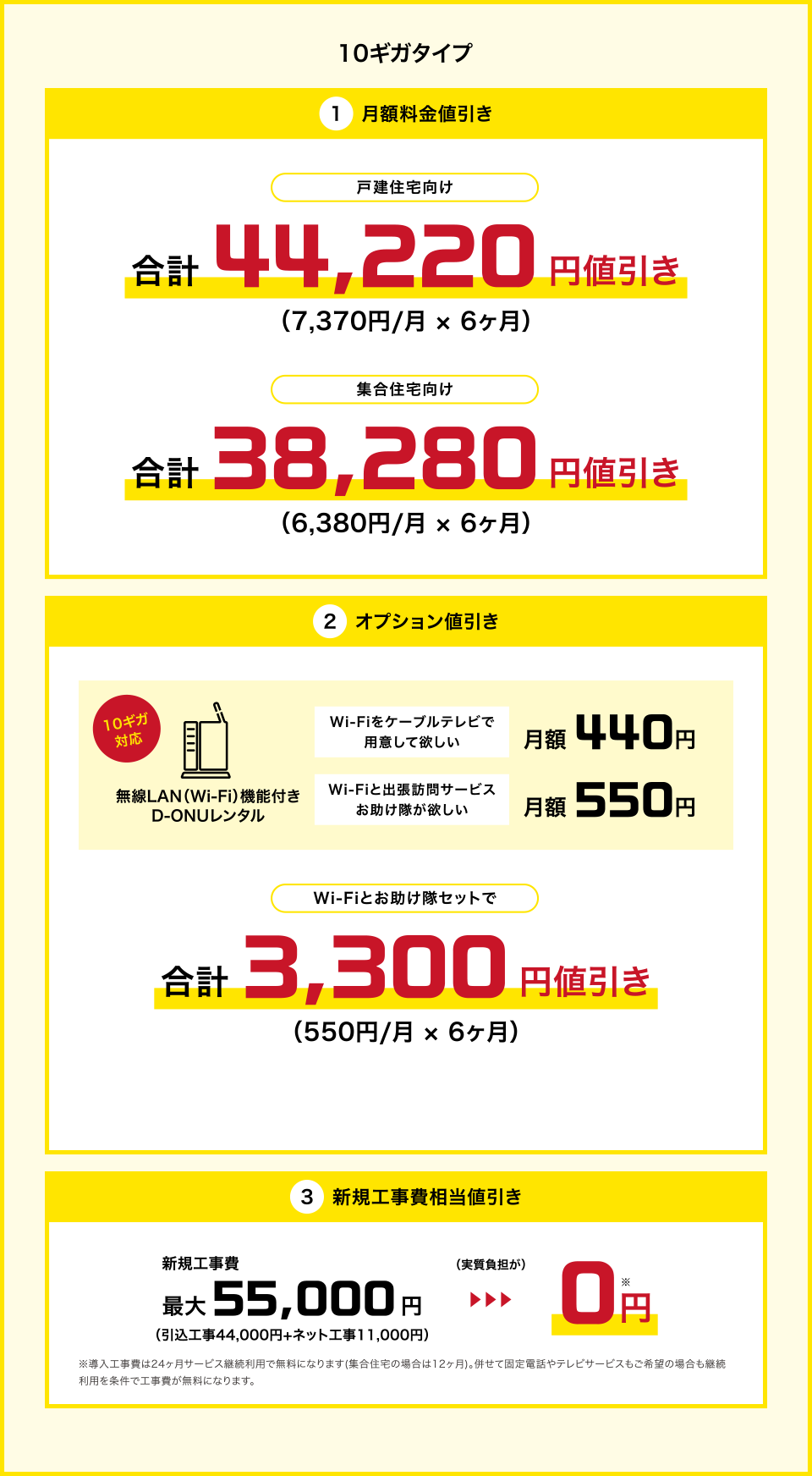 ※ 利用料総額は10ギガ7,370円及び無線LAN機能付きD-ONU・お助け隊550円の6ヶ月分の利用料です。